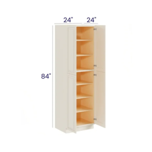 Charleston White – Utility Pantry – 24″W X 24″D X 84″H. Two Adjustable Top Shelves, Three Bottom Shelves. Note: Roll Out Shelf Kits Available.