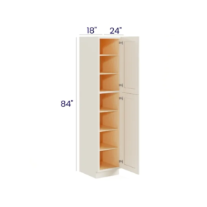 Charleston White – Utility Pantry – 18″W X 24″D X 84″H. Two Adjustable Top Shelves, Three Bottom Shelves. Note: Roll Out Shelf Kits Available.