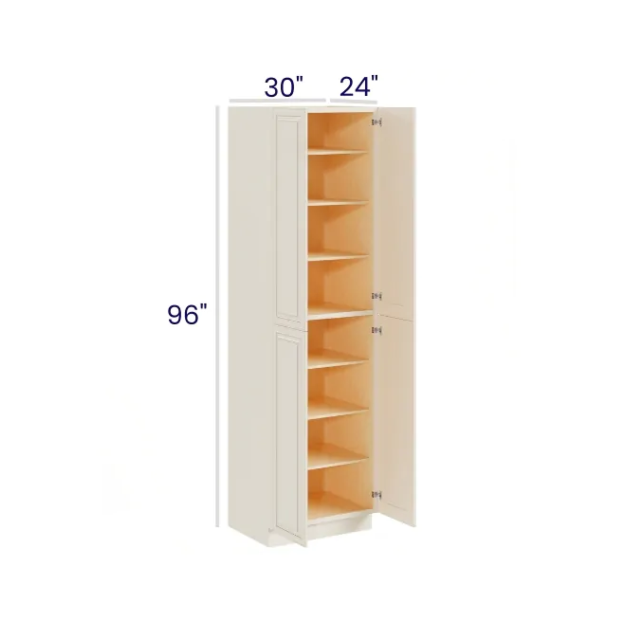 Charleston White – Oven Pantry – 30″W X 96″H X 24″D – Opening 24″W X 24-3/8″H. Two Door, One Large Open Shelf, Three Bottom Drawers. Note: Drawers May Be Removed To Accommodate Double Ovens.