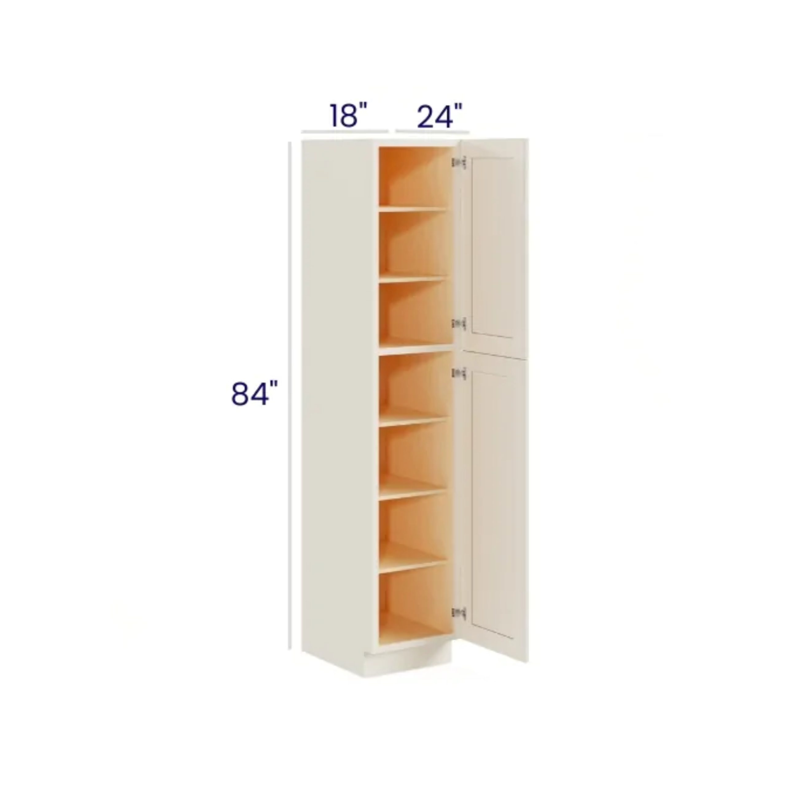 ALL CABINETSCharleston White – Utility Pantry – 18″W X 24″D X 84″H. Two Adjustable Top Shelves, Three Bottom Shelves. Note: Roll Out Shelf Kits Available.