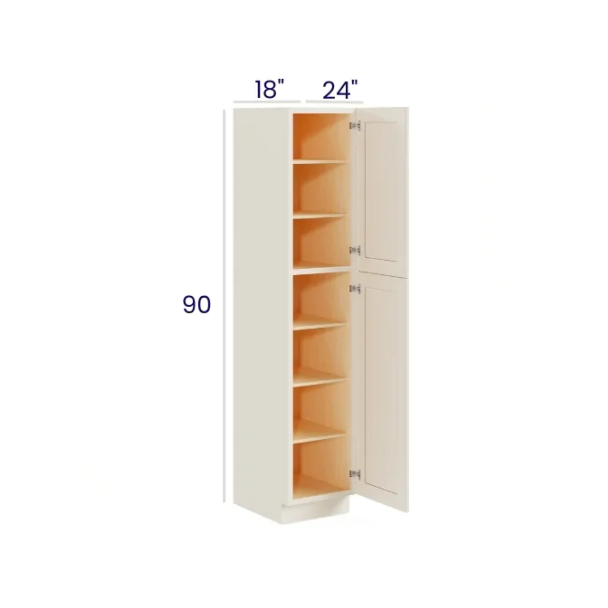 Charleston White – Utility Pantry – 18″W X 24″D X 90″H. Two Adjustable Top Shelves, Three Bottom Shelves. Note: Roll Out Shelf Kits Available.