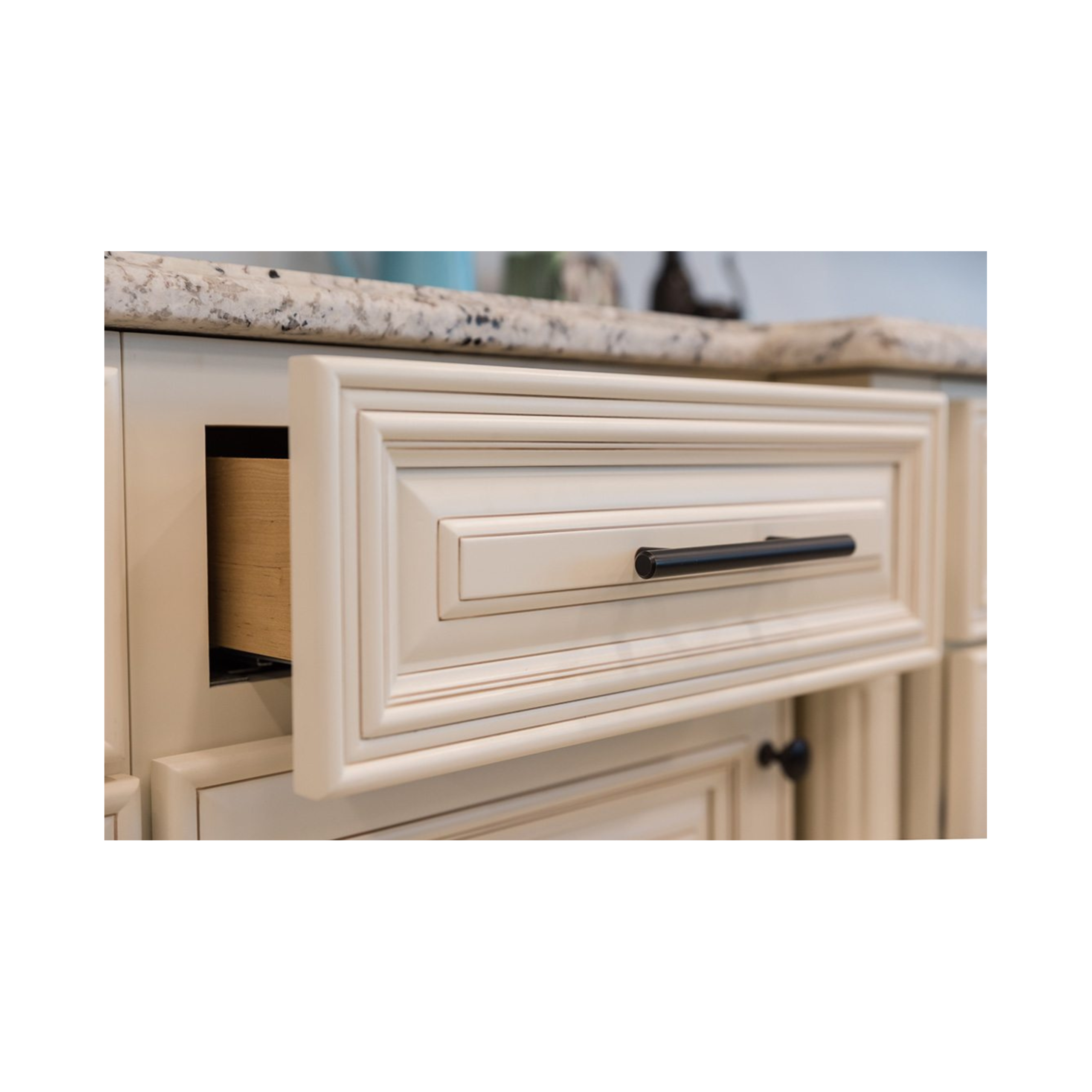 SPECIFICATIONS Full overlay panel door and drawer front. ¾ inch thick solid wood frame with MDF center. ¾ inch thick cabinet grade plywood shelving with front edge banding. Dovetail drawers with solid wood on all sides. ½ inch cabinet-grade plywood box. UV coated natural plywood interior. Concealed undermount full extension drawer glides with soft close feature. 6 way adjustable European style hinge with soft close feature. Door bumpers