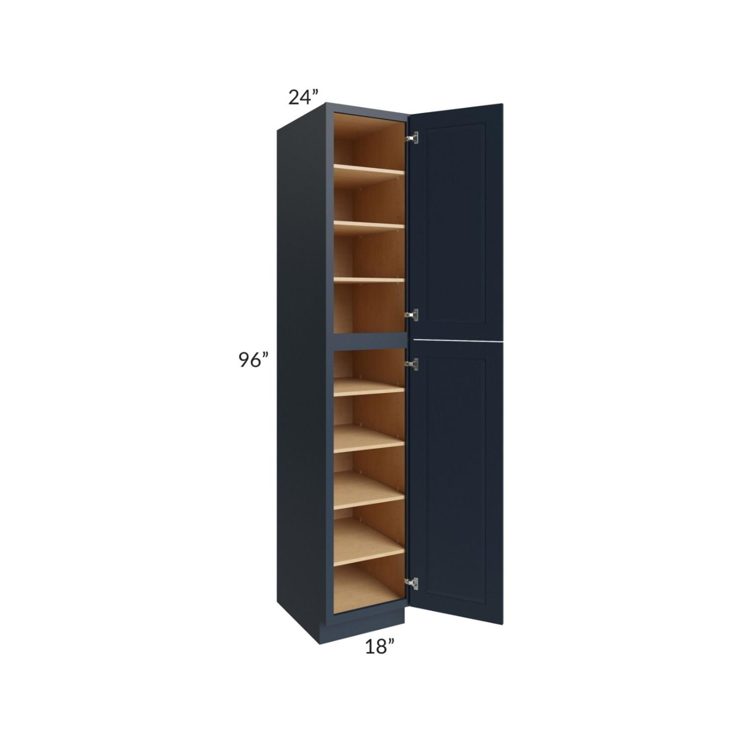 Navy Blue Shaker – Utility Pantry – 18″W X 24″D X 96″H. Two Adjustable Top Shelves, Three Bottom Shelves. Note: Roll Out Shelf Kits Available.