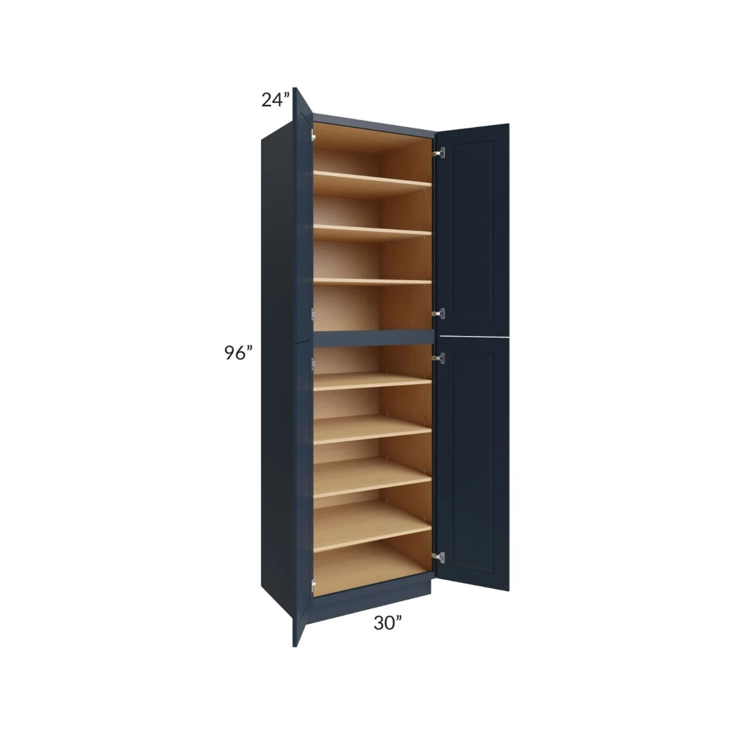 Navy Blue Shaker – Utility Pantry – 30″W X 24″D X 96″H. Two Adjustable Top Shelves, Three Bottom Shelves. Note: Roll Out Shelf Kits Available