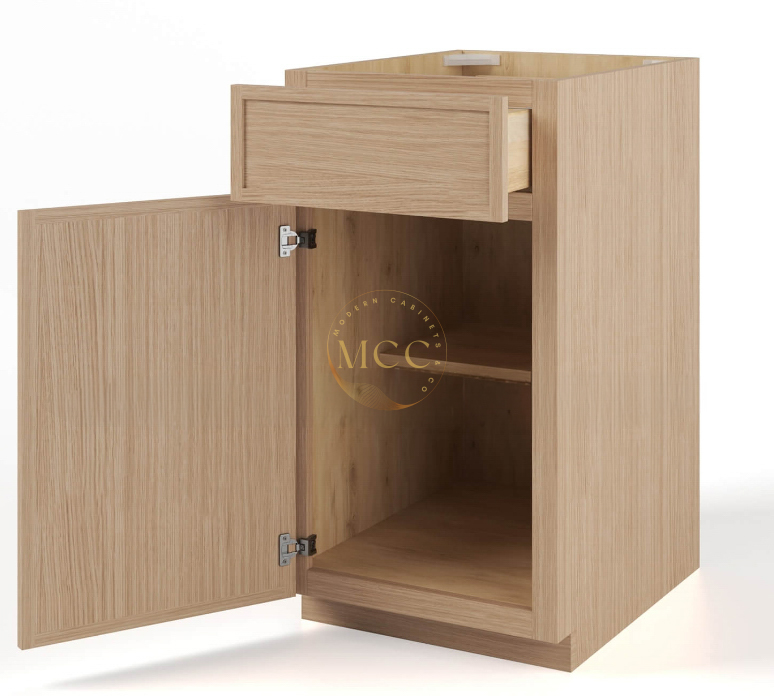 Modern Cabinets Slim Oak Shaker Cabinets Line is crafted with meticulous attention to detail, this Slim Oak Shaker Three Drawers Base boasts a top-grade “A” plywood cabinet box for exceptional durability and sturdiness. Modern Cabinets cabinets feature European soft-close hinges and glides, ensuring smooth and quiet operation every time.