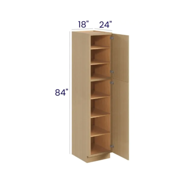 Slim White Oak – Utility Pantry – 18″W X 24″D X 84″H. Two Adjustable Top Shelves, Three Bottom Shelves. Note: Roll Out Shelf Kits Available.