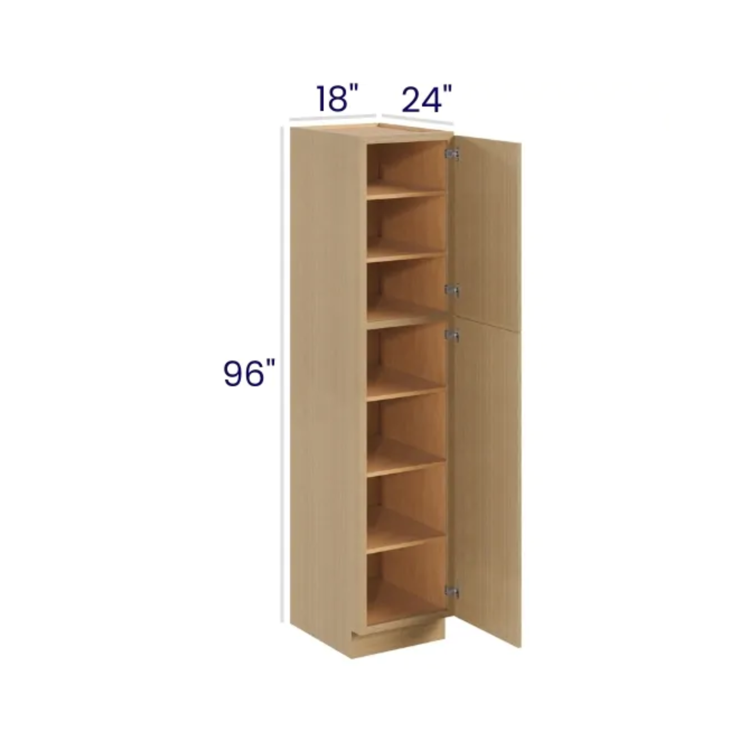 Slim White Oak – Utility Pantry – 18″W X 24″D X 96″H. Two Adjustable Top Shelves, Three Bottom Shelves. Note: Roll Out Shelf Kits Available.