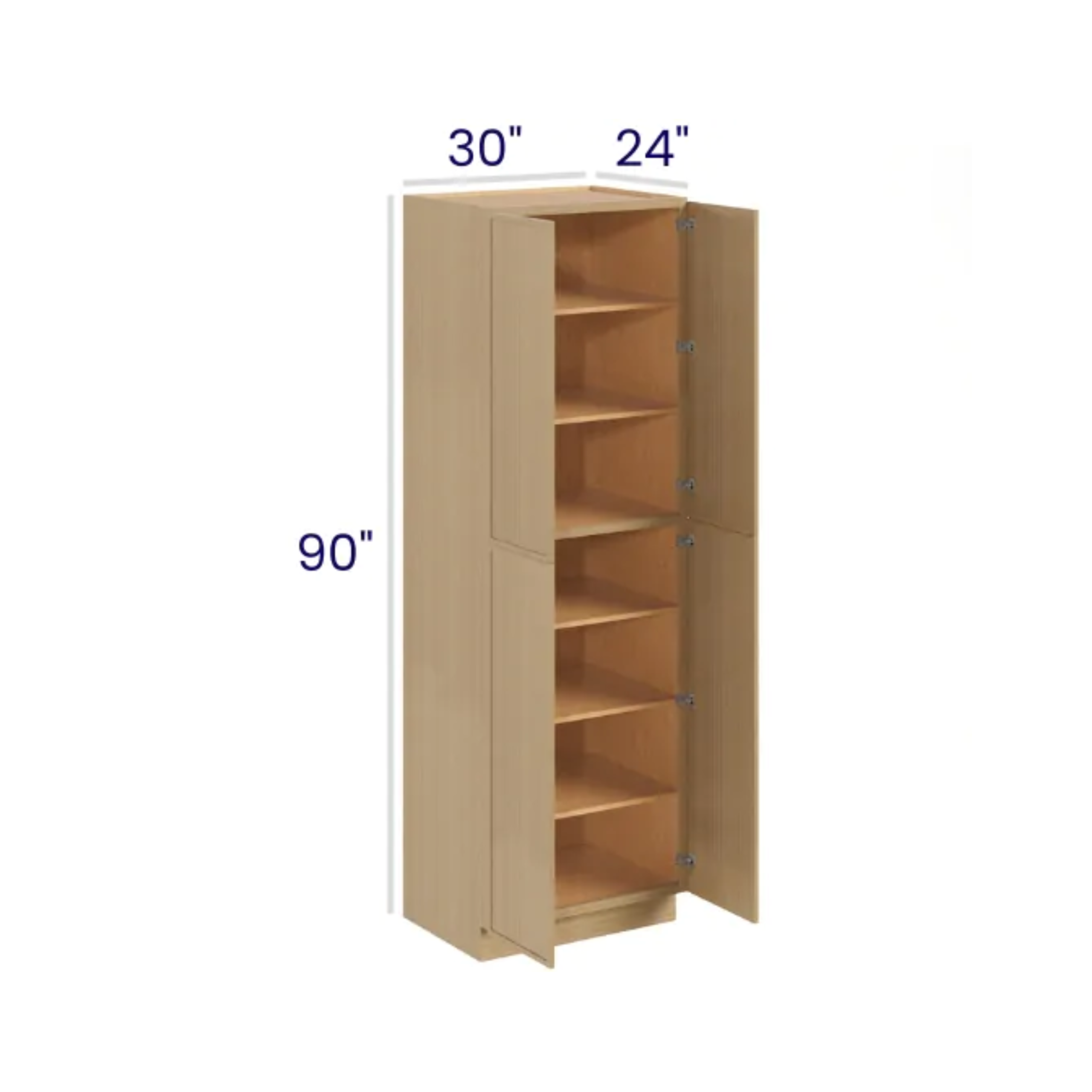 Slim White Oak – Utility Pantry – 30″W X 24″D X 90″H. Two Adjustable Top Shelves, Three Bottom Shelves. Note: Roll Out Shelf Kits Available.